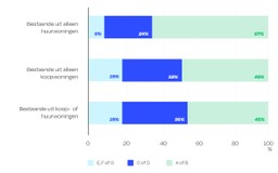 In VvE’s die bestaan uit koopwoningen, beschikte 49 procent van de gelabelde woningen over een A- of B-label. VvE’s met een mix van koop- en huurwoningen hadden het minst vaak woningen met een energiezuinig label; slechts 45 procent.
